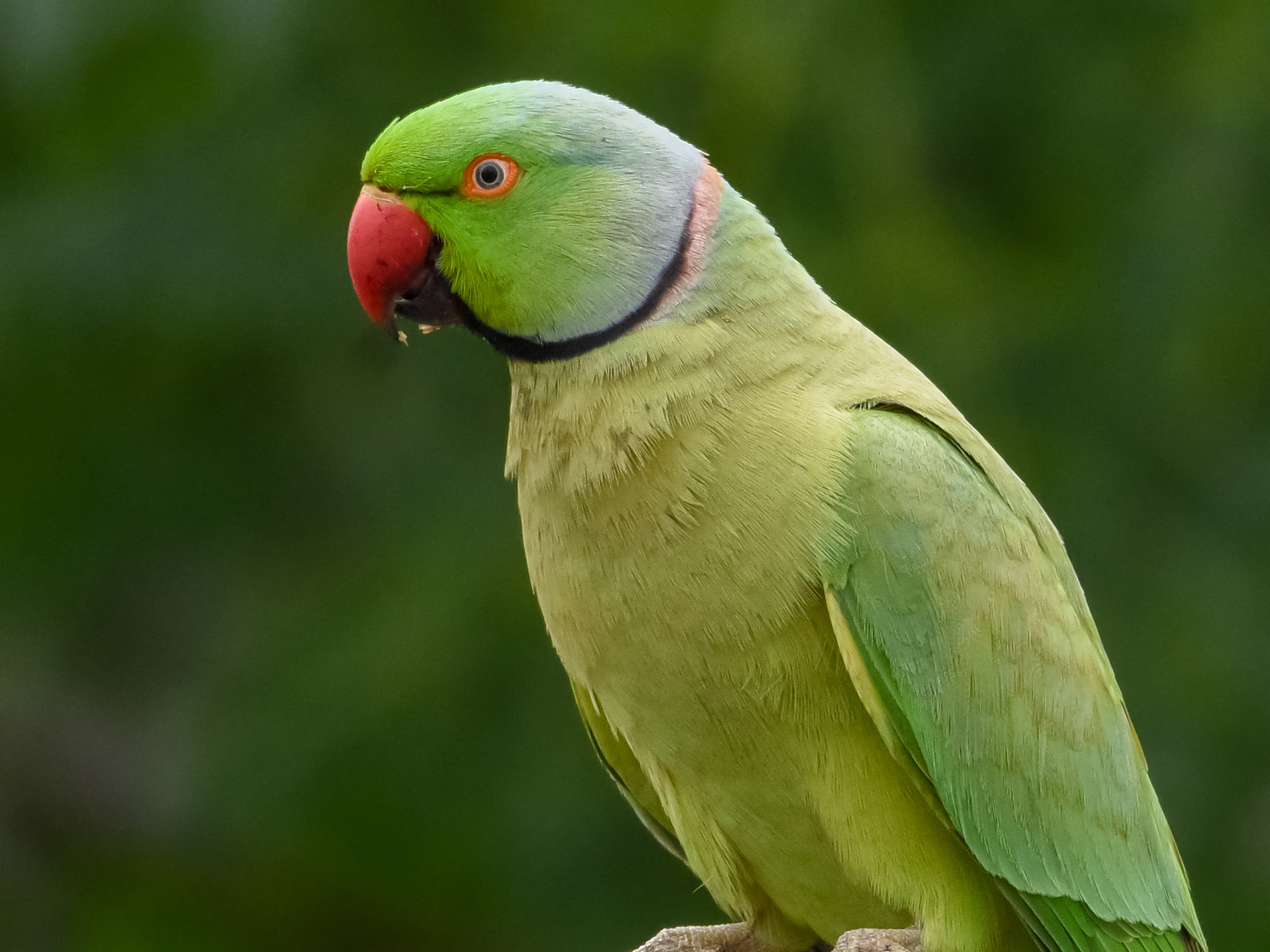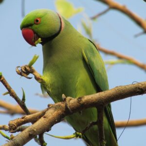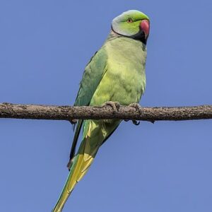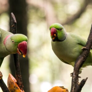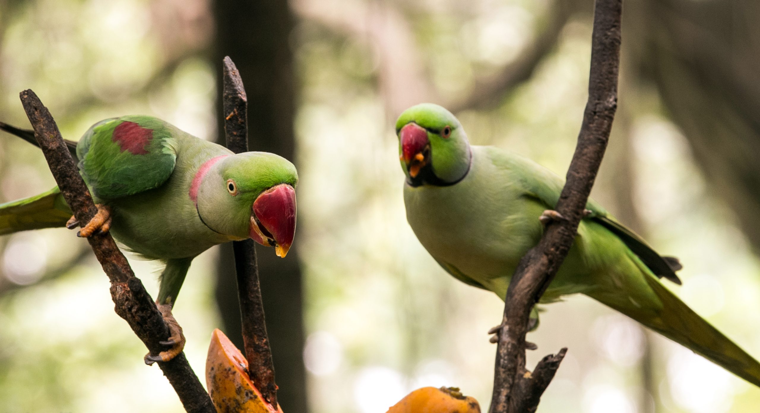 The Alexandrine parakeet lives in forests, woodlands and agricultural areas at elevations of up to 900 m (3,000 ft).