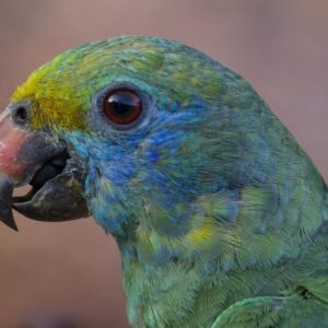 It is about 34 cm (13 in) long. Its coloring is mostly green, with blue cheeks from around the eye to the neck (less on young), a yellow-orange wing speculum, a yellowish crown, and orange lores (the region between the eye and bill on the side of a bird’s head). The binomial of this species commemorates the French zoologist Louis Dufresne. Now monotypic, it formerly included the red-browed amazon as a subspecies. This species appears to live in pairs in the interior of tropical and subtropical forests while breeding. During the summer, Blue-Cheeked Amazon parrots migrate in flocks of varying size to coastal areas. In July and August, Blue-cheeked amazons move irregularly to coastal regions.